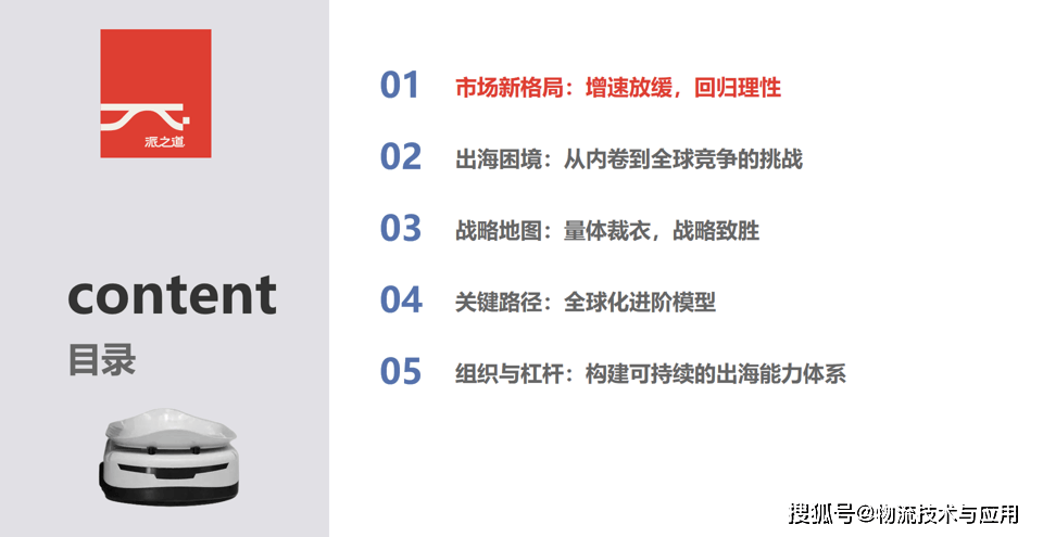 当前,全球挪动机械人市场正处于一个环节转机点,从迸发式高速增加阶段过渡到成长阶段。将来五年复合增加率估计调整至20%摆布,这一变化标记着行业合作逻辑的底子性改变——从逃求规模扩张转向建立焦点合作力。中国物流机械人财产正在履历国内市场激烈的同质化合作后,出海计谋已成为浩繁企业寻求冲破和增加的第二曲线。然而,全球化之充满复杂挑和,企业遍及面对市场需求差别、文化隔膜、品牌认知不脚以及地缘波动等多沉。本文基于对中国物流机械人企业出海实践的深切察看取系统阐发,提出了一套完整的计谋演进框架。文章从意从手艺导向转向场景驱动、从低价合作转向价值共创、从单点冲破转向生态协同的计谋升维径。我们建立了聚焦亚太、冲破欧美、引领全球的三阶段全球化进阶模子,并从组织能力、跨文化协做、合做伙伴选择及风险管控等多个维度,深切切磋若何建立可持续的出海能力系统。本文旨正在为中国物流机械人企业供给切实可行的全球化成长思,帮力其正在全球市场中成立持久合作劣势。当前,全球挪动机械人市场正处于一个环节转机点,从迸发式高速增加阶段过渡到成长阶段。将来五年复合增加率估计调整至20%摆布,这一变化标记着行业合作逻辑的底子性改变——从逃求规模扩张转向建立焦点合作力。中国物流机械人财产正在履历国内市场激烈的同质化合作后,出海计谋已成为浩繁企业寻求冲破和增加的第二曲线。然而,全球化之充满复杂挑和,企业遍及面对市场需求差别、文化隔膜、品牌认知不脚以及地缘波动等多沉。本文基于对中国物流机械人企业出海实践的深切察看取系统阐发,提出了一套完整的计谋演进框架。文章从意从手艺导向转向场景驱动、从低价合作转向价值共创、从单点冲破转向生态协同的计谋升维径。我们建立了聚焦亚太、冲破欧美、引领全球的三阶段全球化进阶模子,并从组织能力、跨文化协做、合做伙伴选择及风险管控等多个维度,深切切磋若何建立可持续的出海能力系统。本文旨正在为中国物流机械人企业供给切实可行的全球化成长思,帮力其正在全球市场中成立持久合作劣势。