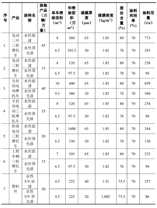 对比上表按照涂料密度、挥发分含量计较出来的涂料VOCs含量,本项目每种涂料的查验演讲中VOCs含量均低于上表计较值,因而本项目采纳最大值核算,利用上表计较的VOCs含量做为判断根据。按照上表,本项目所用涂料满脚江苏省处所尺度《涂猜中挥发性无机物限量》(DB32/T3500-2019)、《低挥发性无机化合物含量涂料产物手艺要求》(GB/T 38597- 2020)和《车辆涂猜中无害物质限量》(GB 24409-2020)中尺度限值要求。本项目拟出产6种摩托车产物,别离为电动三开三轮摩托车、电动车三轮摩托车、工程车辆三轮摩托车、全封锁电动摩托车、半封锁电动三轮摩托车、休闲电动三轮摩托车,因而本项目针对6种产物计较喷涂涂料用量。按照企业供给的电动车喷涂部件的尺寸,面漆喷涂一遍,罩光漆喷涂一遍。喷涂采用机械喷涂,喷涂操纵率约70%,年喷漆电动三轮摩托车150万辆,年喷涂塑料件50万件。