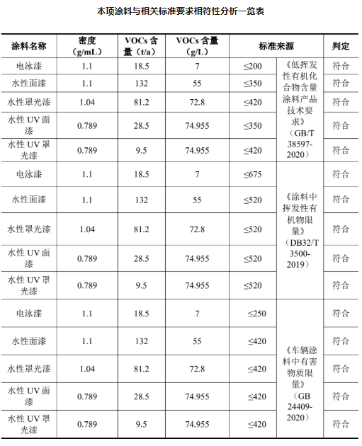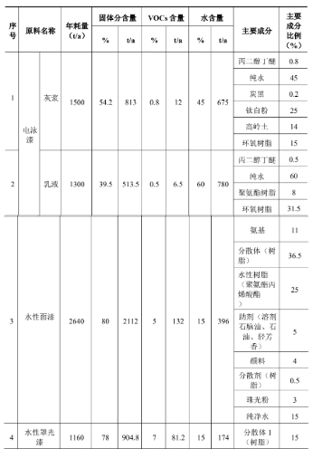 按照工艺设想材料,本项目电泳漆由乳液和色浆配制而成,比例为15!13(质量比),调配后电泳漆利用量为2800t/a,调配后密度以1。1g/mL 计,按照表4。2-3。电泳漆中 VOCs 含量18。5t/a。本项目水性面漆利用量为2640t/a,水性罩光漆利用量为1160t/a。水性面漆中VOCs含量132t/a,水性罩光漆中VOCs含量81。2t/a。此中VOCs含量为28。5t/a;水性UV罩光漆利用量为 100t/a,此中VOCs含量为9。5t/a。本项目电泳漆、水性面漆、水性清漆、水性UV面漆、水性UV罩光漆VOCs含量要求参照《涂猜中挥发性无机物限量》(DB32/T 3500-2019)、