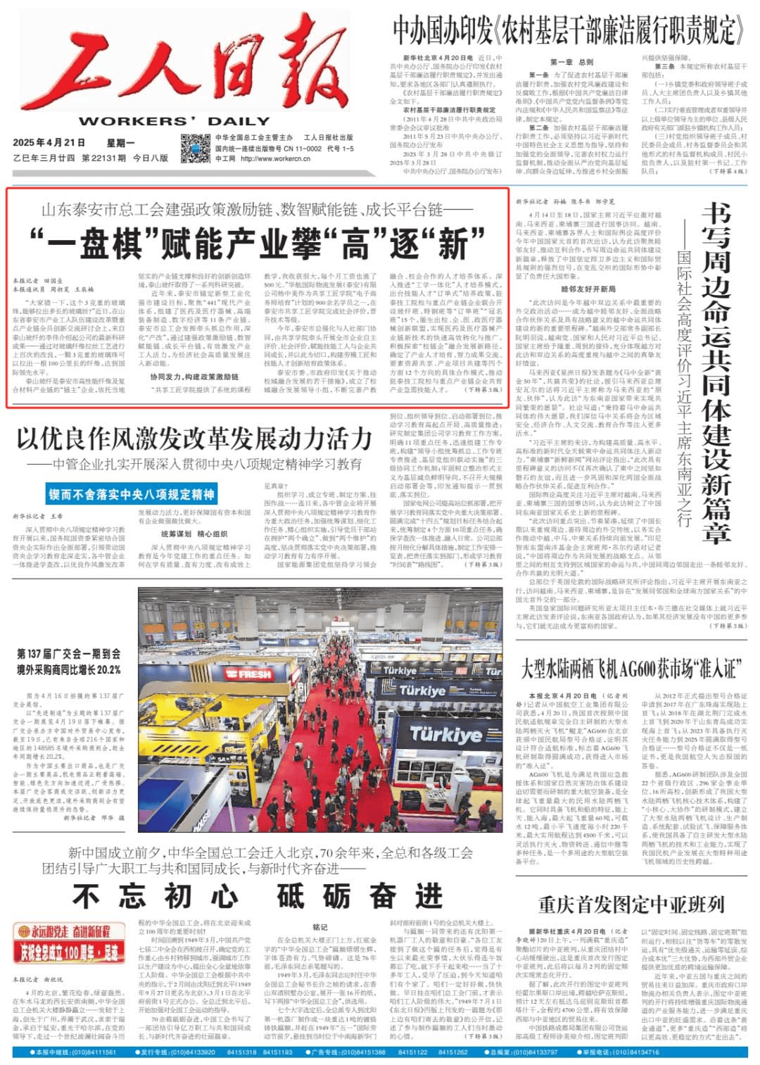 4月21日,《工人日报》头版头条以《山东泰安市总工会建强政策激励链、数智赋能链、成长平台链——“一盘棋”赋能财产攀“高”逐“新”》为题,对市总工会深化财产工人步队扶植工做经验进行了报道。同日,《山东工人报》头版头条以《“量”深耕但愿的郊野》为题,对市总工会帮力村落复兴工做进行了报道。